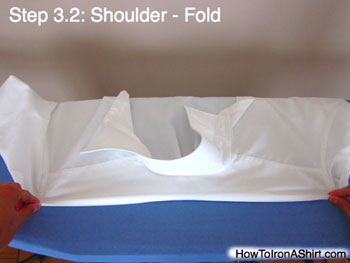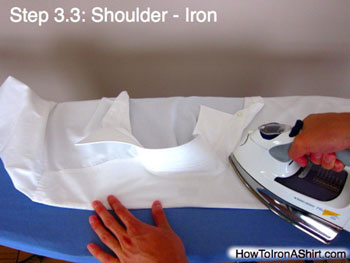 Step 3.3: Shoulder - Iron: Ironing the shoulder section this way prevents creases at the top of the shoulders that don’t align with the seams of the shirt. With your free hand continually pull out lumps and wrinkles to avoid creating more creases.