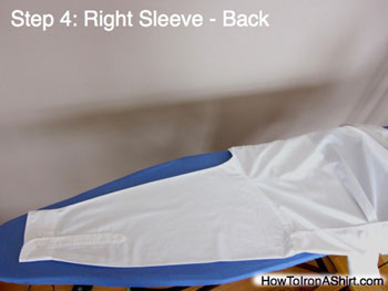 Step 4: Right Sleeve - Back: Lay the right sleeve flat using the seam at the bottom of the sleeve as a guide. and iron out the wrinkles. Note: It is important to carefully iron out wrinkles in the seams as well as open areas. Remember the seams around your shoulder and wrist, as they are noticeable, especially when reaching for a hand shake.