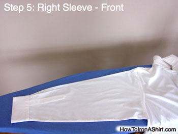 Step 5: Right Sleeve - Front: Flip the shirt over and repeat the same steps on the front of the sleeve. Remember the front side of the shirt is part of your visual presentation. To ensure it would be wrinkle-free, iron the front surface after ironing the back surface.